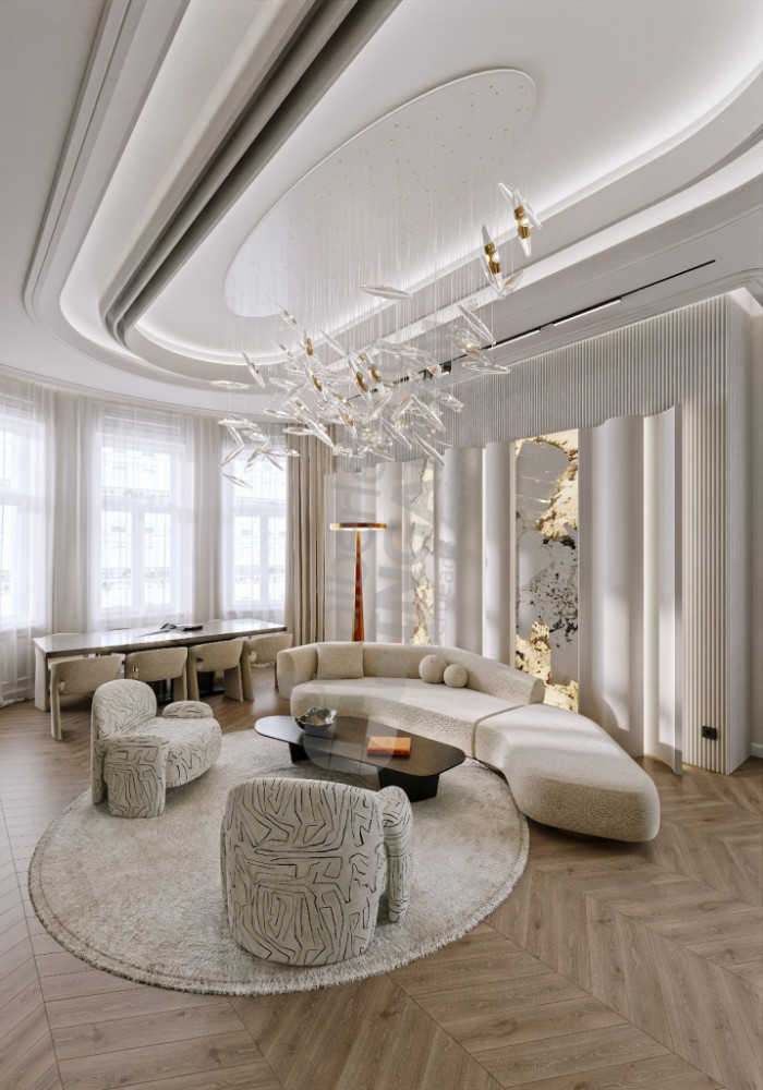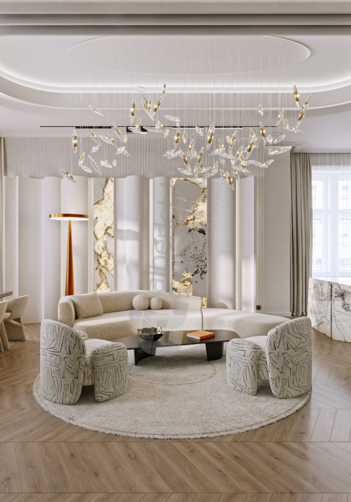 walls are enriched with delicate plaster installations and hidden LED lights, which are