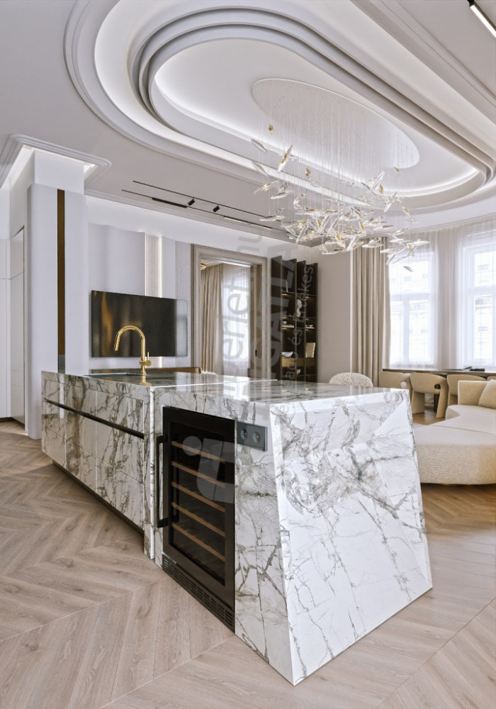 Kitchen island made with FMG covering. The marble-effect surface is the natural stone