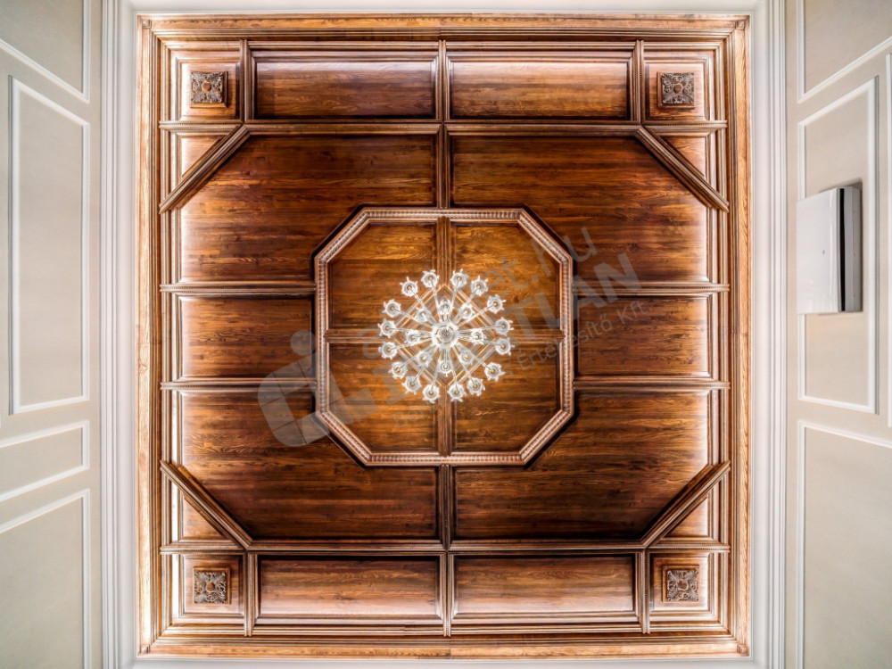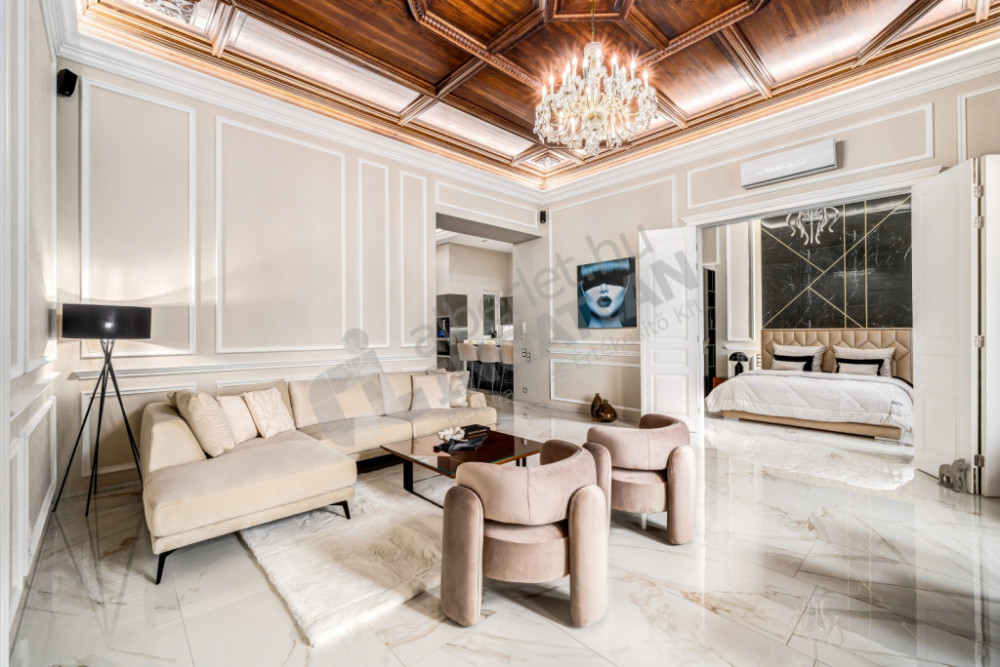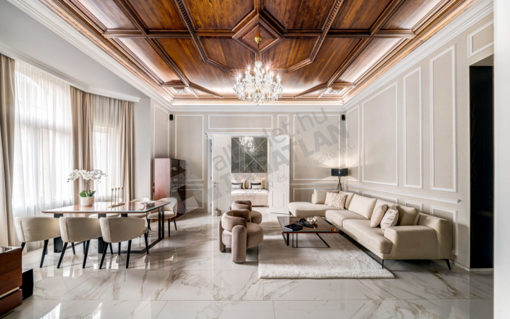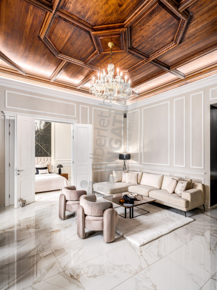 The most striking special feature of the apartment is the uniquely designed and manufactured solid wood stained ash ceiling in the living room. The furniture designed here is all the result of meticulous handwork. Thanks to the built-in wardrobes found in the bedrooms opening from the living room, there is plenty of storage space.