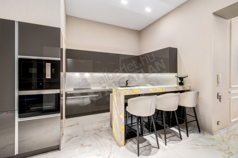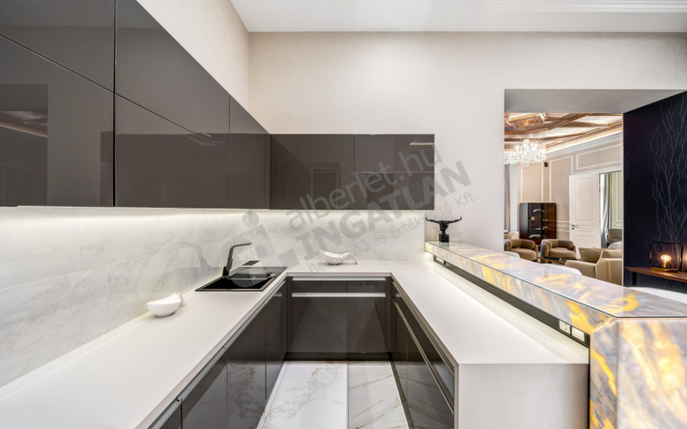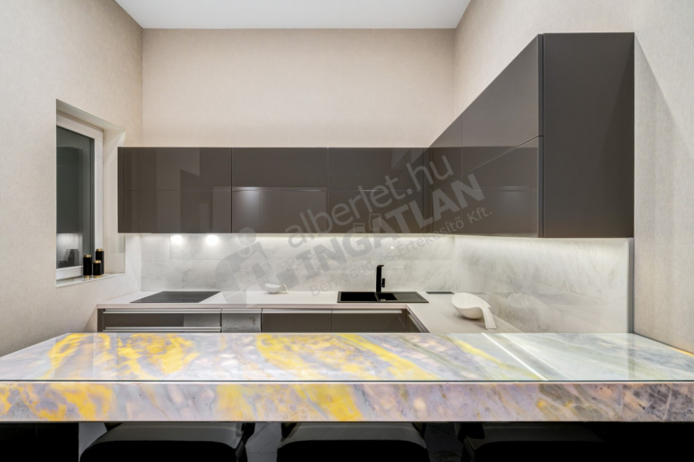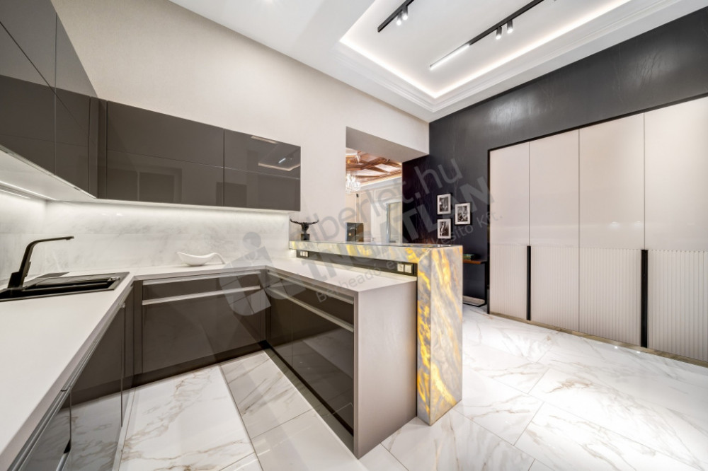 The kitchen is fully equipped and mechanized (Gorenje, Electrolux and Zanussi appliances), the kitchen furniture was also made according to custom designs. As a decorative element, a marble bar counter illuminated with cold and warm light closes the kitchen island, which makes this room truly impressive.