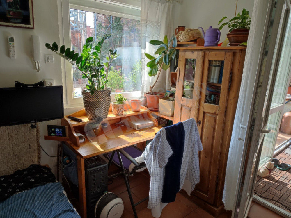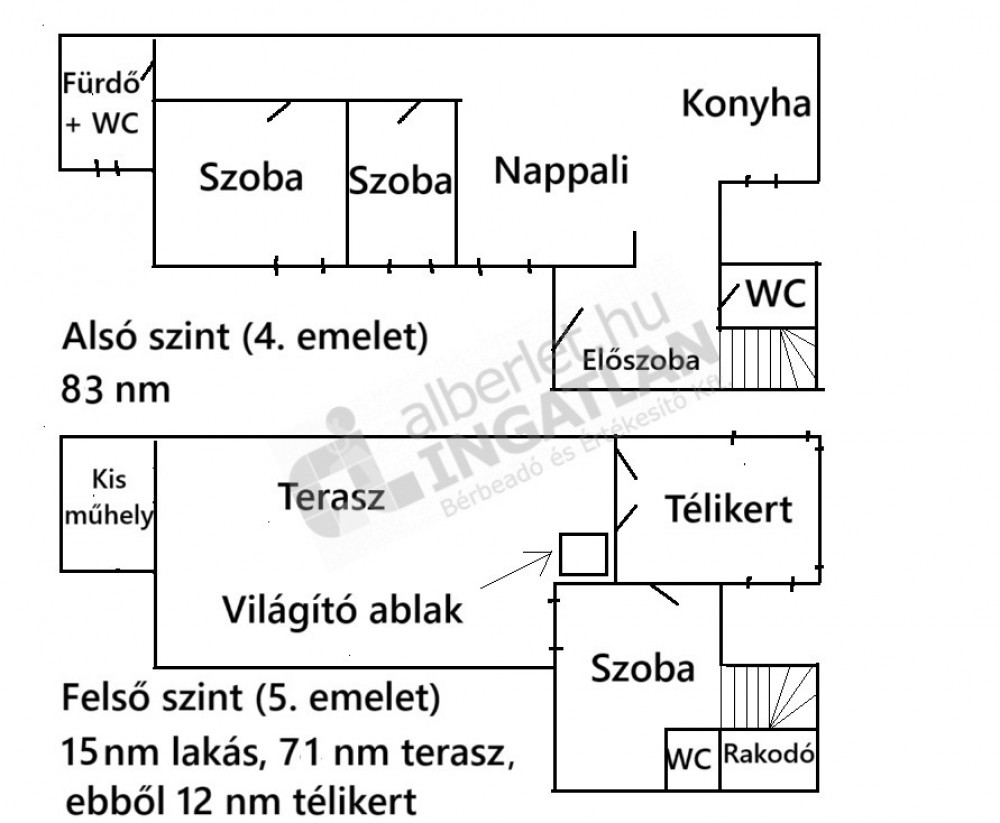 The apartment is located on the fourth and fifth floors, the lower level is defined by the living space, and the upper level is determined by the roof garden and conservatory. On the lower, 83 square meter residential level, there is a living-dining-kitchen (31.3 m²), two separate bedrooms (15.3 m² and 8 m²), a bathroom with a toilet (5.9 m²), a separate toilet with a laundry room and storage room (4.1 m²), an entrance hall (6.5 m²) and a hallway (10.9 m²). On the upper level of 85.5 square meters, there is a 10 m² room, a toilet (1.21 m²), a storage room (1.1 m²) and a 2.3 m² staircase, and the 71 m² terrace is a real jewel of the apartment. The 12 m² part of the terrace functions as a nicely built conservatory, which is the home of plants in winter and can be used as a rest or study in summer.