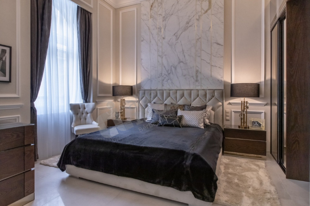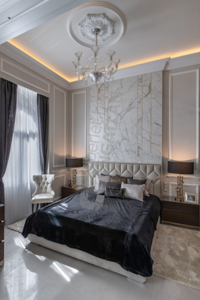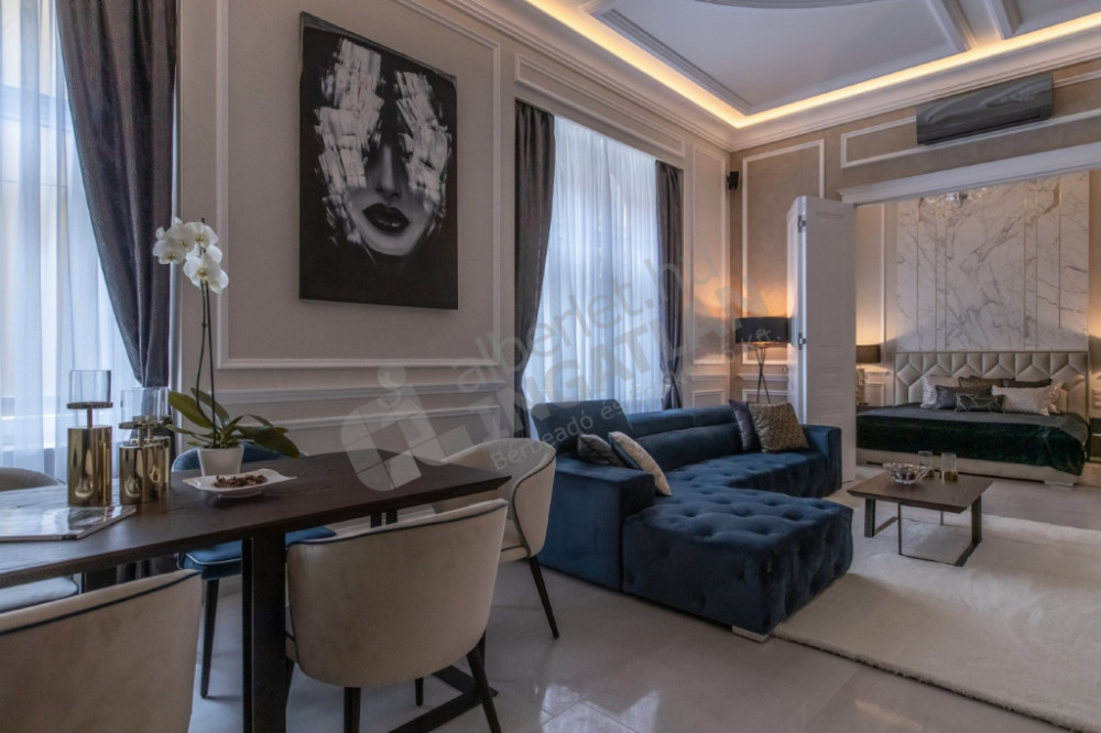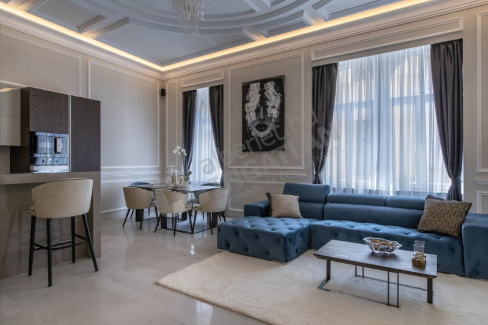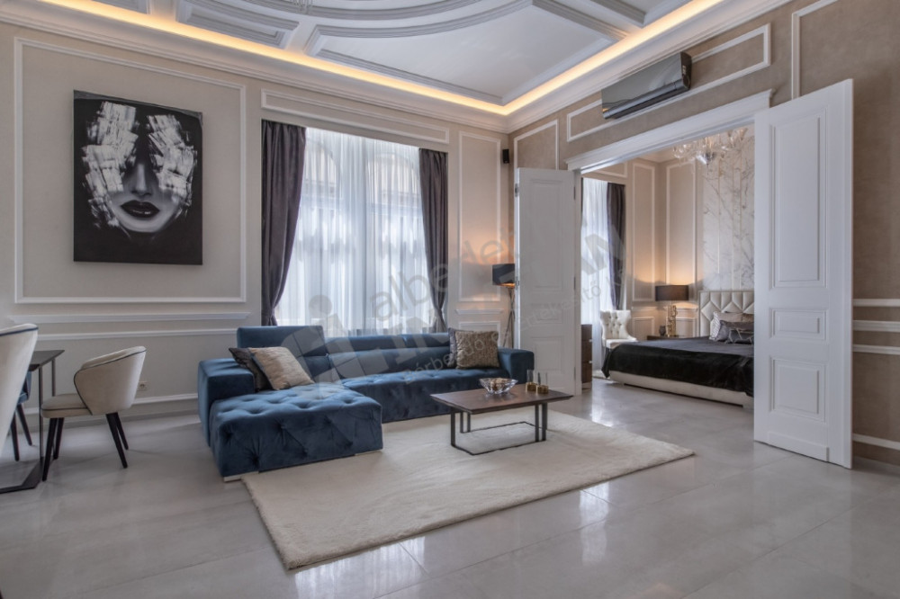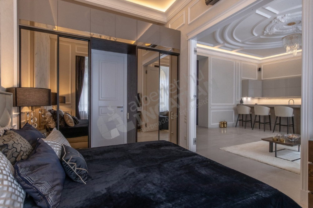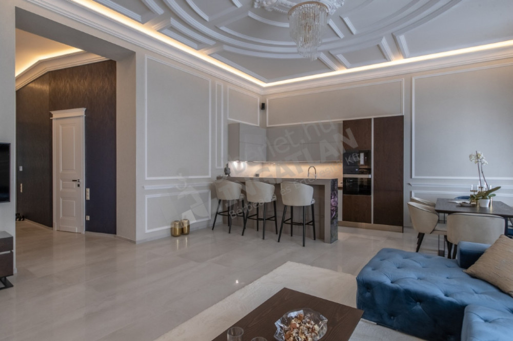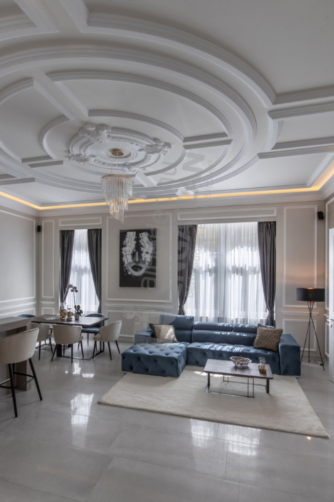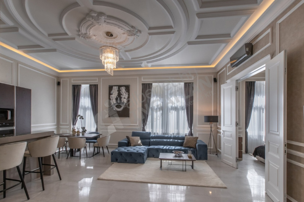 The most striking specialty of the apartment is the uniquely designed and manufactured plaster ceiling in the living room and bedrooms, as well as the plaster cassettes on the side walls evoking a bourgeois atmosphere, all of which were made with unique handiwork.