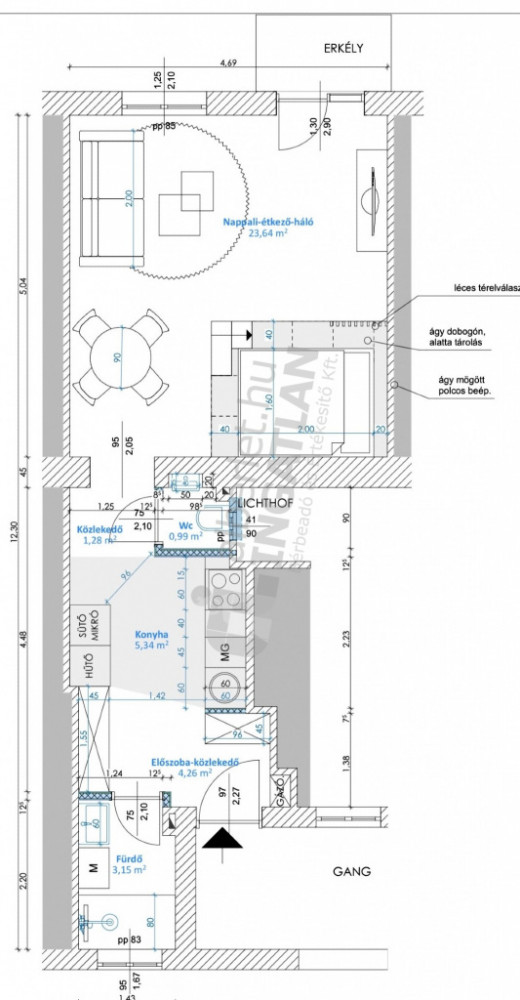 The apartment has a practical layout: a raised bed in the living room and bedroom provides extra storage space, the bathroom and toilet are in separate rooms. The balcony overlooks a quiet side street. The apartment is bright, east-west oriented, the condominium is clean and tidy.