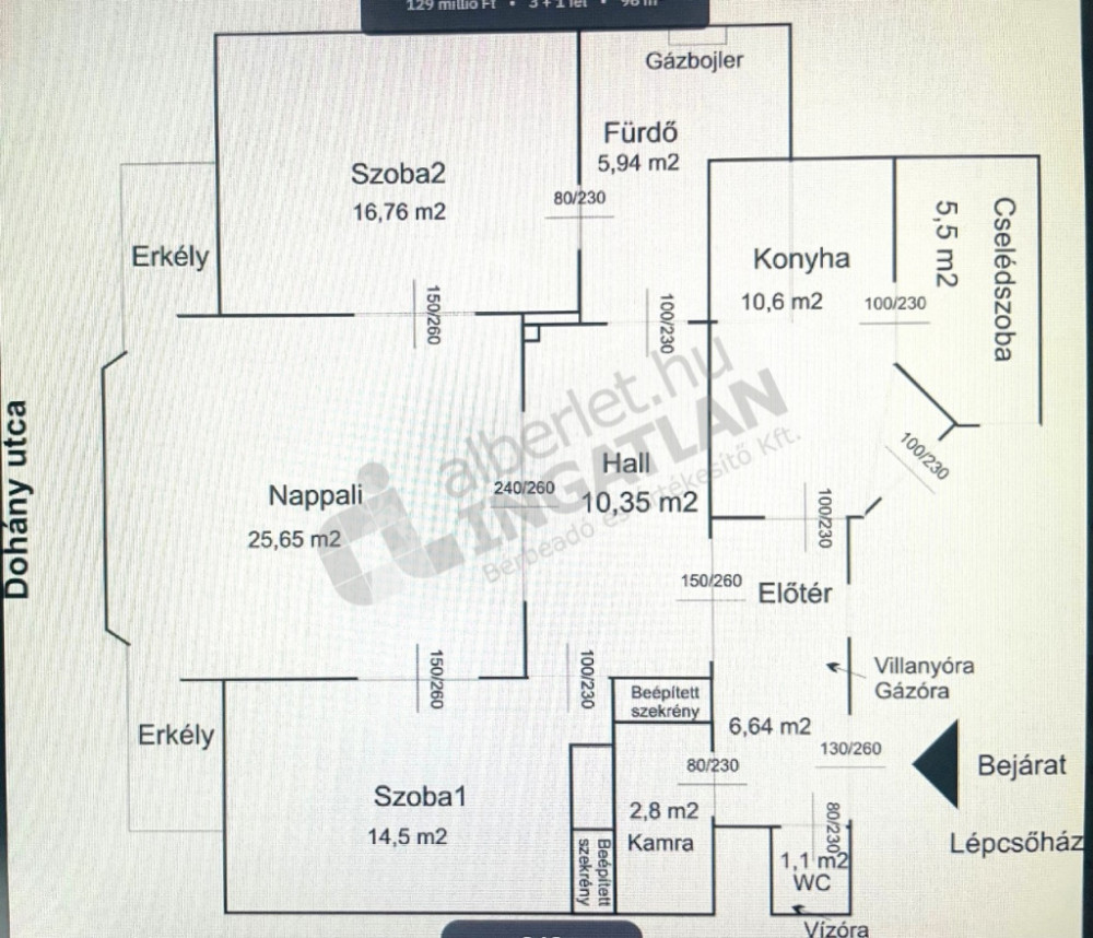 Helyiségek: 3,5 szoba, hall, konyha, kamra, fürdőszoba, külön WC, előtér,