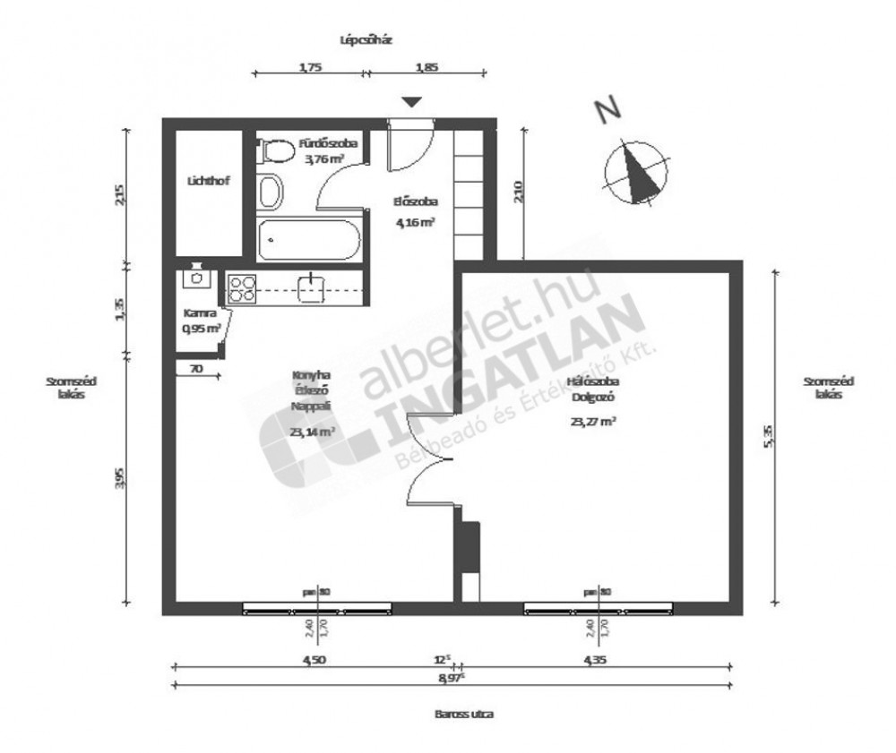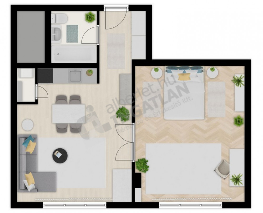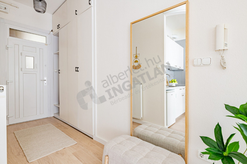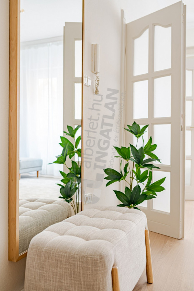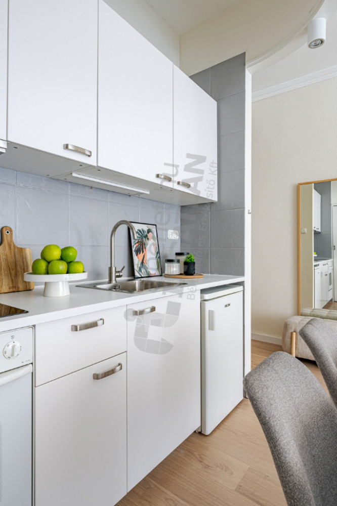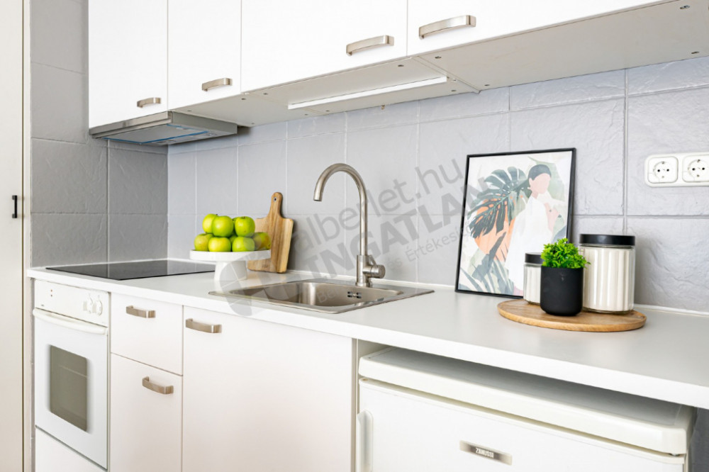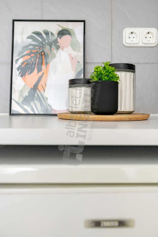 Az előszobában lévő hatalmas beépített szekrény rengeteg holmit elnyel, ami rendkívül praktikussá teszi a tárolást. A konyhába teljesen új konyhabútor került beépítésre, új indukciós tűzhellyel és páraelszívóval. Közvetlenül a konyhából nyílik egy kisméretű polcozott kamra, amiben a kombi cirkós gázkazán is helyet kapott, mely a fűtést és a melegvizet biztosítja. Az amerikai konyhás nappaliból nyílik a nagyméretű hálószoba, melyben méretéből adódóan elfér egy dolgozósarok, valamint további tárolóbútorok is, ezzel növelve a lakás tárolóhely-kapacitását.