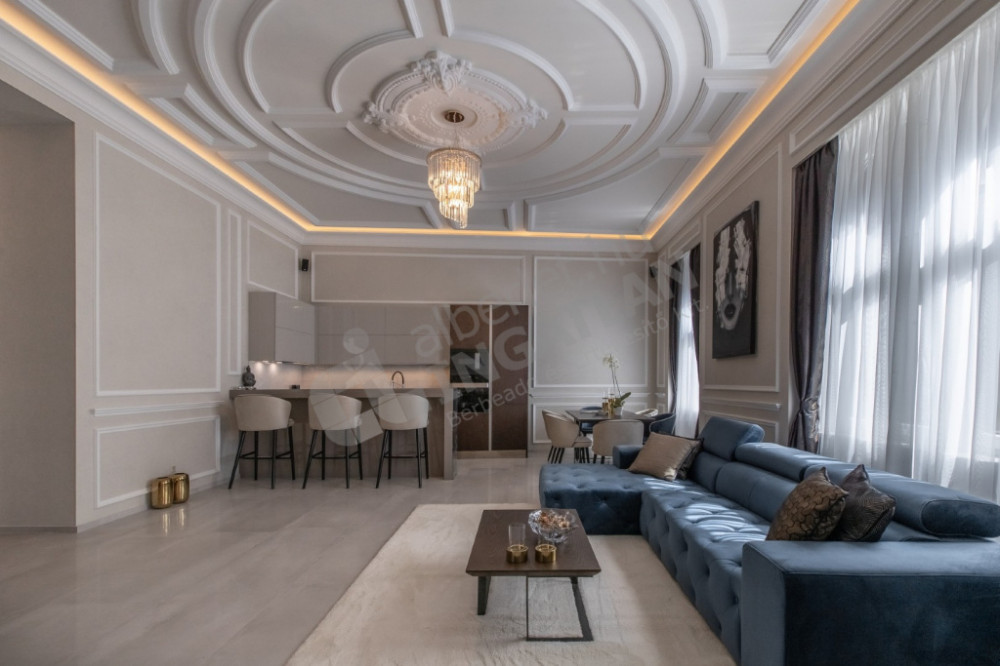 The most striking specialty of the apartment is the uniquely designed and manufactured plaster ceiling in the living room and bedrooms, as well as the plaster cassettes on the side walls evoking a bourgeois atmosphere, all of which were made with unique handiwork.