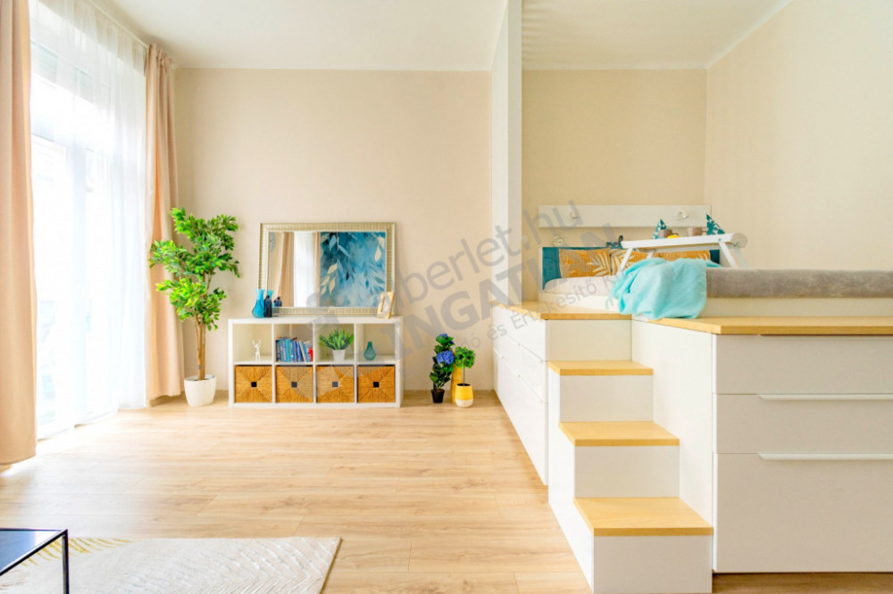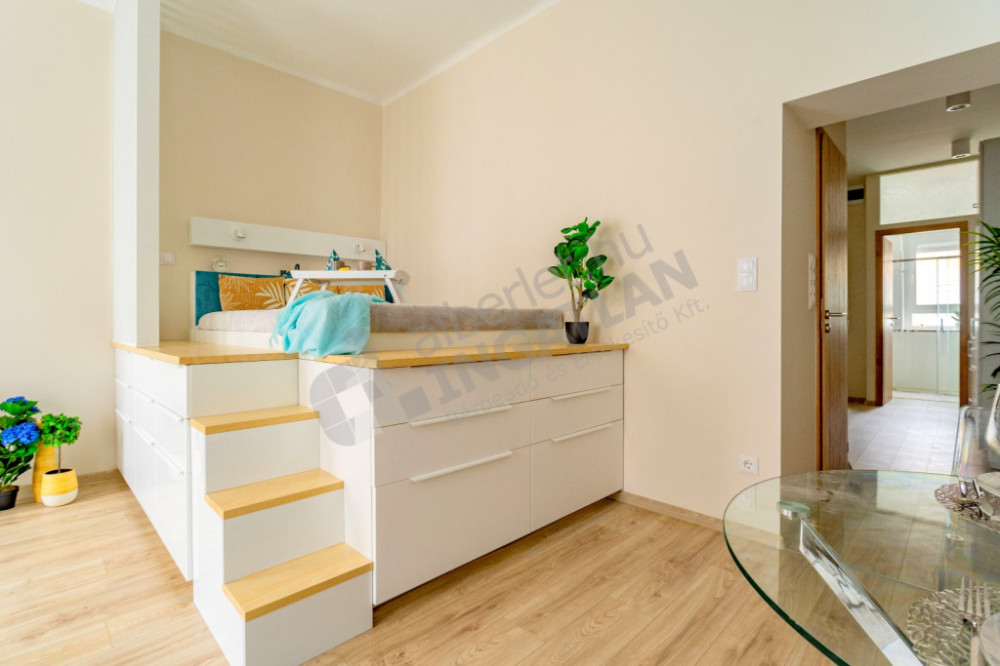 The apartment has a practical layout: a raised bed in the living room and bedroom provides extra storage space, the bathroom and toilet are in separate rooms. The balcony overlooks a quiet side street. The apartment is bright, east-west oriented, the condominium is clean and tidy.