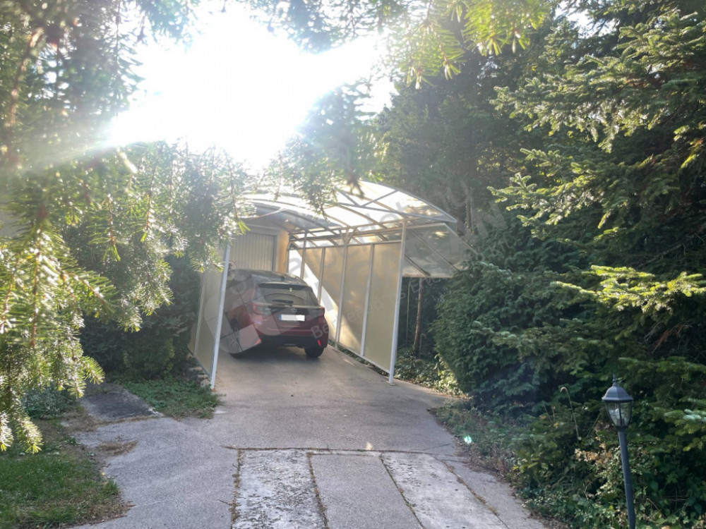 The 20 m² terrace opens from the living room and overlooks the 825 m² well-kept garden planted with evergreens. The house also has a garage and an additional carport.