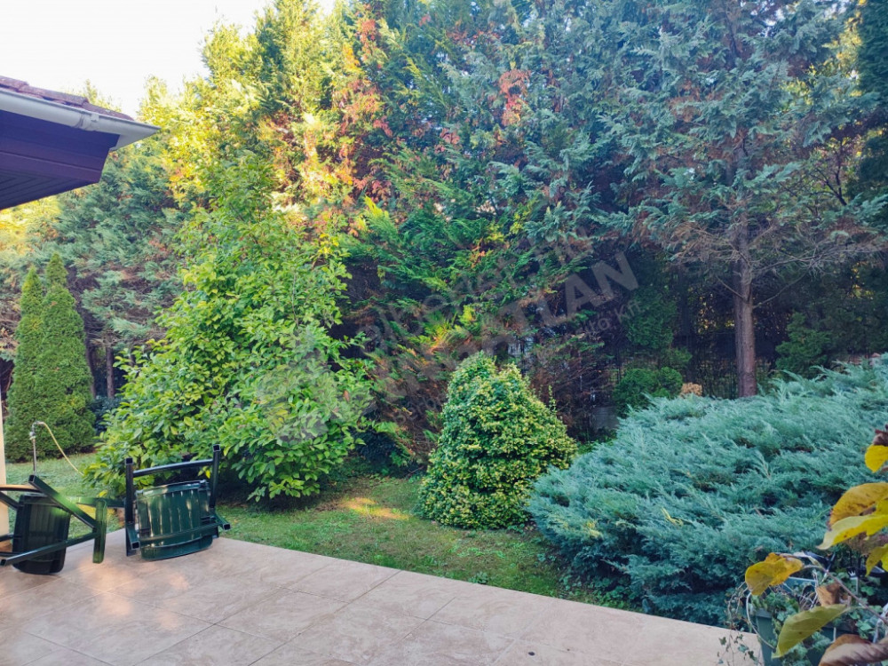 A nappaliból nyíló 20 m²-es terasz a 825 m²-es, gondozott, örökzöldekkel beültetett kertre néz. A házhoz garázs és további gépkocsi-beálló is tartozik.