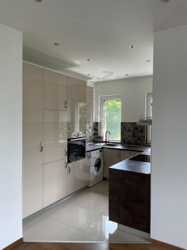 The apartment is divided into: living room with American kitchen, one bedroom, half room, separate bathroom and separate toilet. The kitchen is compact yet usable, fully mechanized (washing machine, dishwasher, oven, induction hob, fridge, freezer).