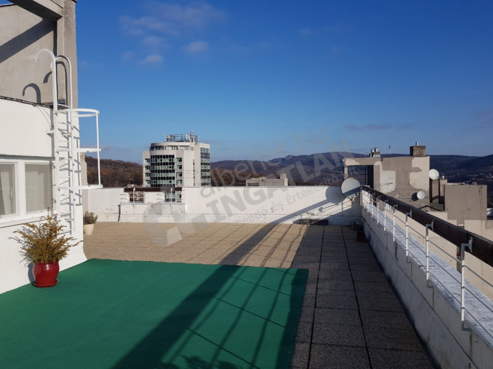 A hálószoba a város felé néz, a nappali oldaláról pedig a hegyek mögötti naplemente élvezhető. A ház rendezett kerttel, saját játszótérrel és egy 300 m²-es tetőterasszal rendelkezik, ahonnan különleges panoráma nyílik a környékre. Barátságos lakóközösség jellemzi az épületet.