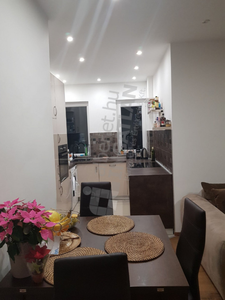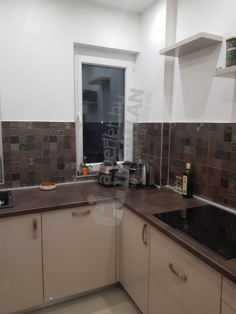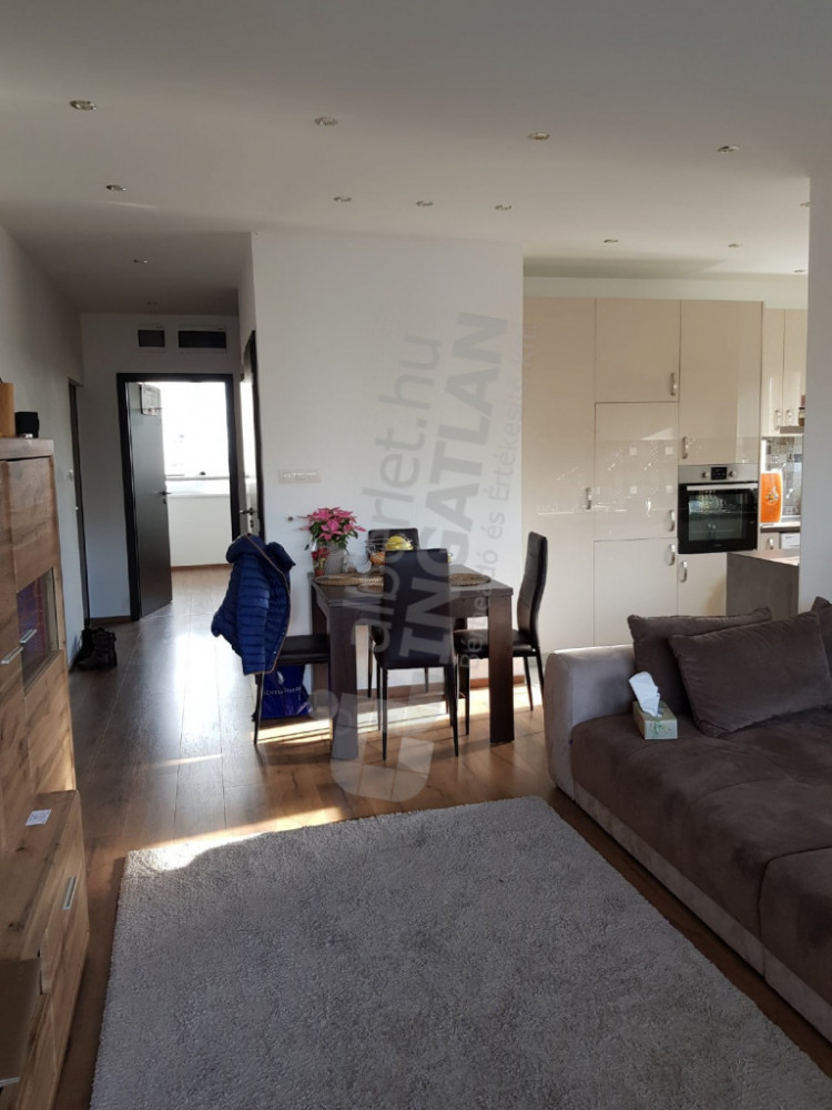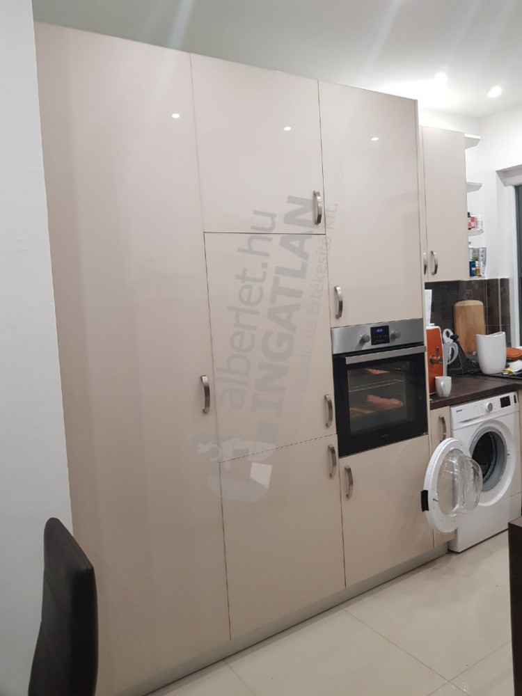 A lakás elosztása: amerikai konyhás nappali, egy hálószoba, egy fél szoba, külön fürdőszoba és külön WC. A konyha kompakt, mégis jól kihasználható, teljesen gépesített (mosógép, mosogatógép, sütő, indukciós főzőlap, hűtő, fagyasztó).