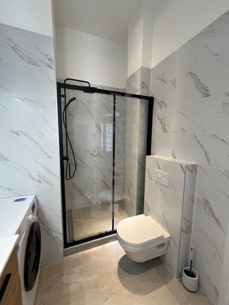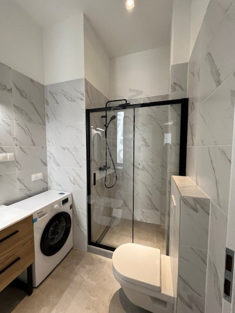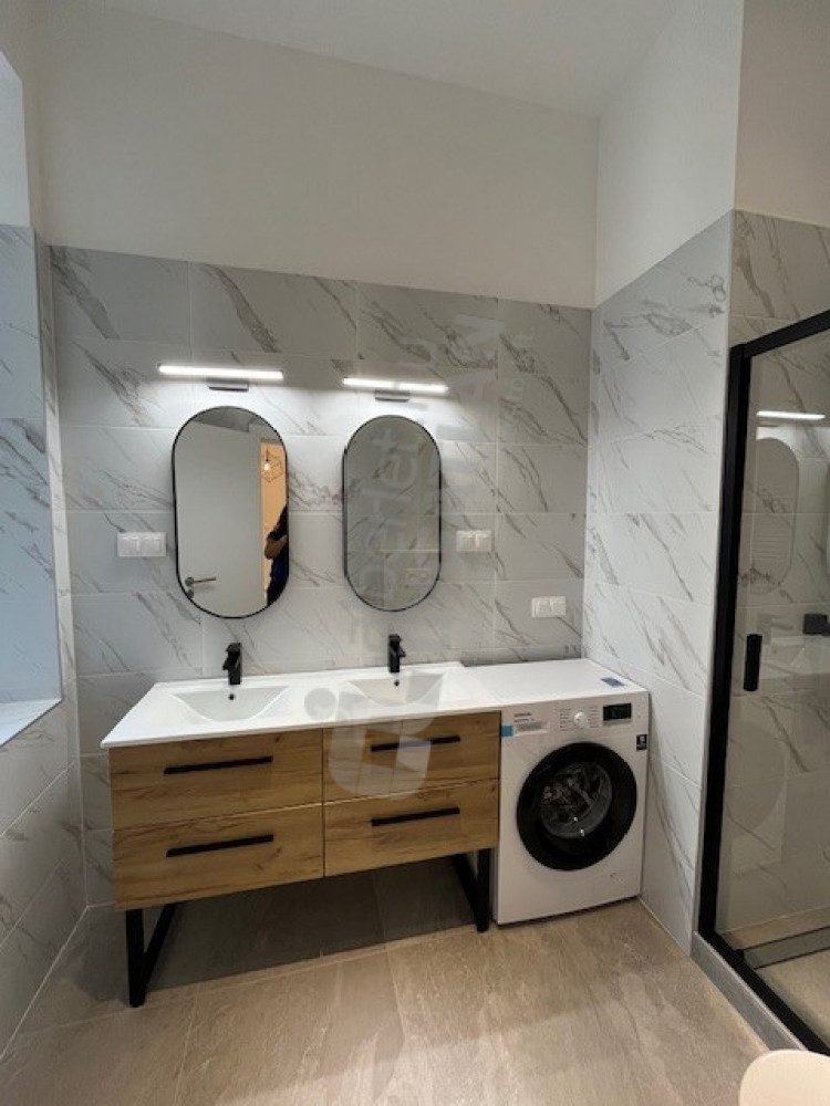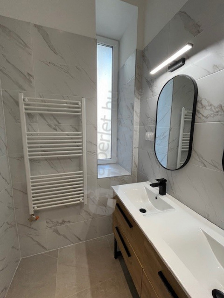 *Stílusos, ablakos fürdőszoba épített zuhanyzóval és dupla mosdóval, valamint külön WC