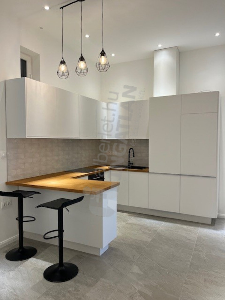 *Tágas, amerikai konyha és étkező – egyedileg tervezett, magas minőségű beépített bútorokkal, konyhaszigettel és modern gépekkel felszerelve (beépített sütő, mikró, főzőlap, mosogatógép)