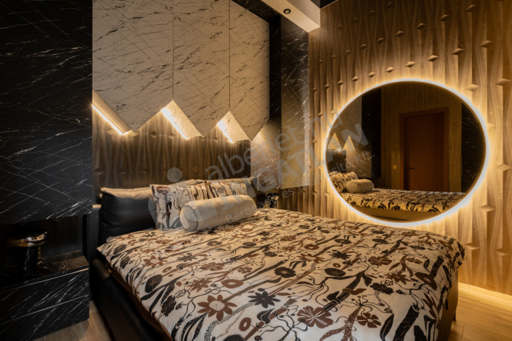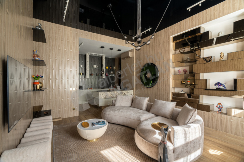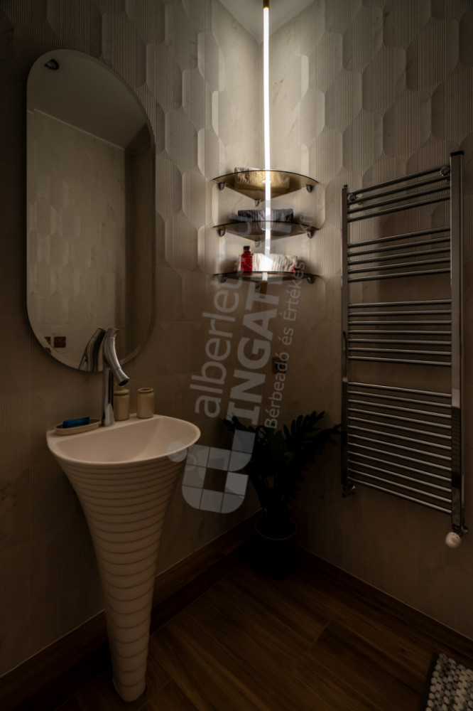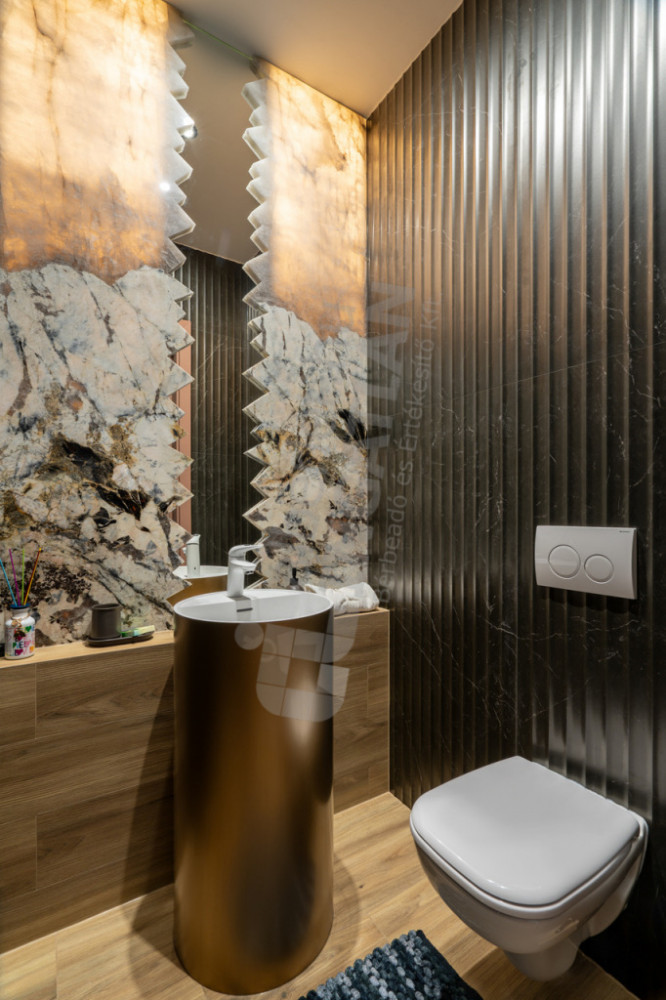 Két fürdőszoba, két hálószoba, prémium csaptelepek, burkolatok, beépített bútorok, fénytestek, stb.
