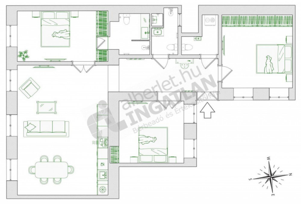 A 137 négyzetméteres alapterület ideális elrendezést kínál: a tágas nappali egyben konyha, étkező és pihenőtér is, mely otthonos és funkcionális központja az ingatlannak. A fő hálószoba saját gardróbbal és privát fürdőszobával rendelkezik, a két további szoba – szintén beépített tárolóval – igény szerint használható hálóként, dolgozóként vagy gyerekszobaként. Emellett különálló második fürdőszoba, vendégmosdó és mosókonyha is helyet kapott.