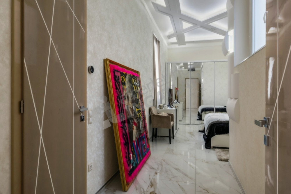 Az egyedi tervezésű falfelületek és a hangulatos LED-világítás impozáns megjelenést kölcsönöznek a belső tereknek, melyet a kézzel készített gipsz mennyezet tovább emel. A lakás modern atmoszféráját neves designmárkák (Kare, BoConcept, Einholtz stb.) gondosan válogatott dekorációi erősítik. A különleges burkolatok, Marburg mosható tapéták, elegáns textilek és kiegészítők harmonikus összhangban teremtik meg a kifinomult luxus érzetét.