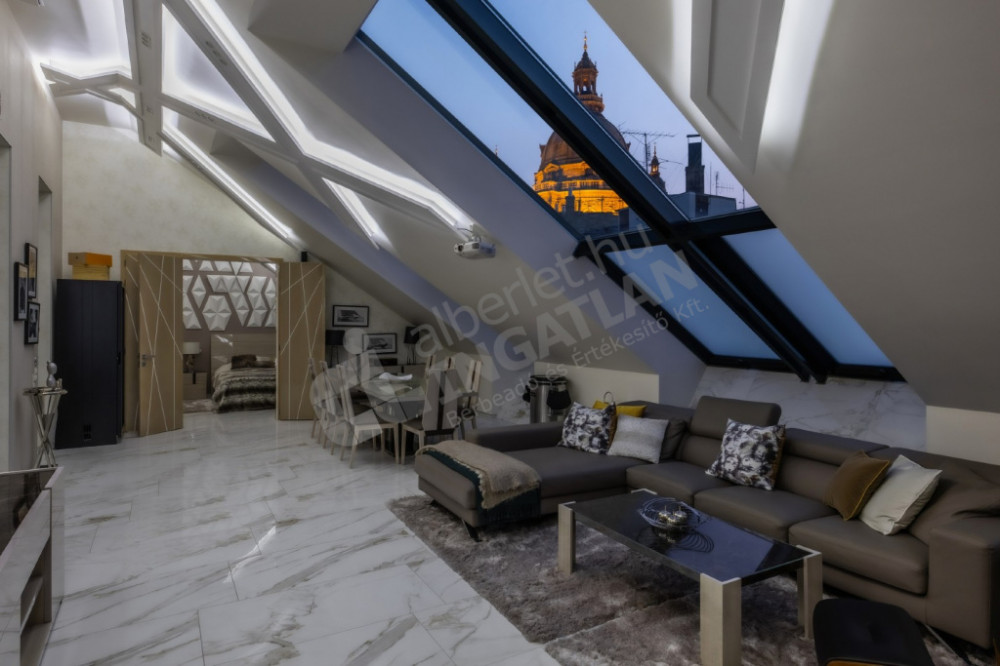 Budapest szívében, kivételes elhelyezkedéssel kínáljuk ezt a magas színvonalon felújított, tetőtéri luxuslakást. Az ingatlan egy 1800-as évek végén épült társasház tetőtéri ráépítéseként valósult meg 2017-ben. A 160 nm-es apartman három hálószobával, három fürdőszobával, saját szaunával, valamint egy privát tetőteraszon elhelyezett jakuzzival biztosítja a maximális kényelmet. A nagyméretű nyílászáróknak köszönhetően a lakás rendkívül világos és napfényes. Különleges adottsága a Szent István Bazilikára nyíló lenyűgöző panoráma, amely az esti órákban, a városi fényekkel kiegészülve igazán egyedülálló látványt nyújt.