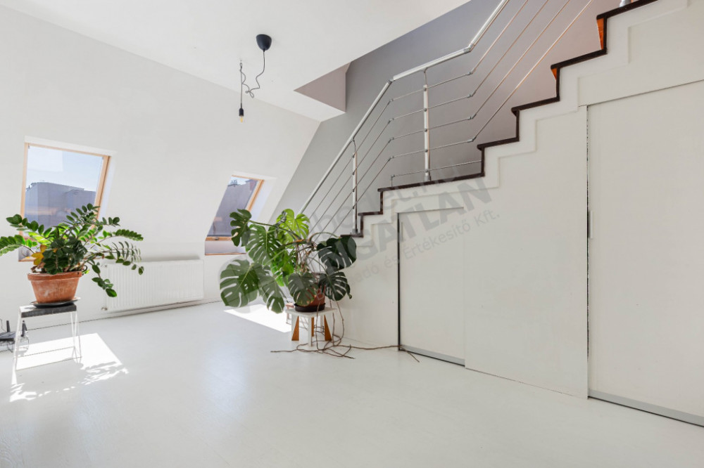 A lakás csendes, világos és szellős, egyedülálló kétszintes kialakítással. Különleges, otthonos hangulatát a nappaliban található kandalló és a természetes anyaghasználat (fa burkolatok) is erősíti. A lakás szinte teljesen elszeparált a többi lakástól, a bejárata egy belső előtérből nyílik, csak egy ablaka néz a belső udvarra.