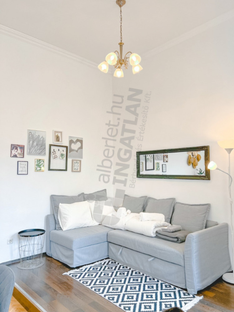 A város szívében található, mégis csendes, világos lakás, nagy belső udvarra néző kilátással.