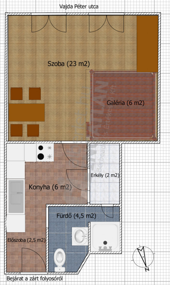 A lakás alapterülete 36 m², egy szobás, 6 m²-es galériával kiegészítve. A 3. emeleten található (lift nincs), déli tájolásának köszönhetően kifejezetten világos. A lakáshoz tartozik egy kb. 2 m²-es erkély, egy külön, zárt folyosóról nyíló, mosógéppel felszerelt tárolóhelyiség, valamint egy önálló pincerekesz is.