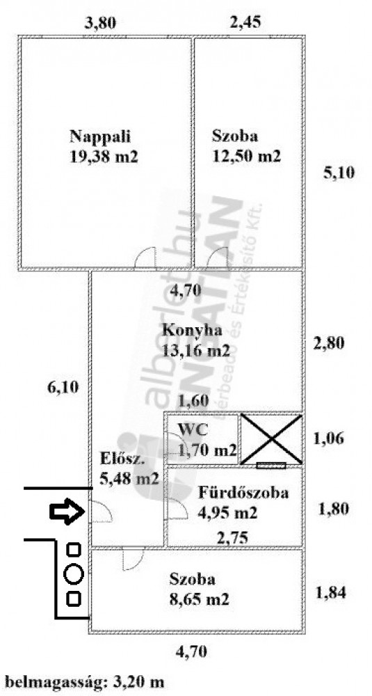 Két külön bejáratú háló (egy nagyobb, egy kisebb), nappali, külön konyha, fürdőszoba WC-vel, valamint egy külön WC.