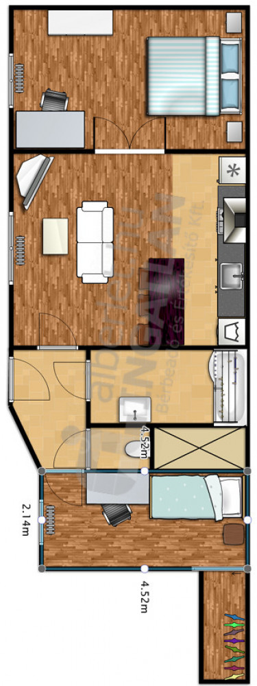 A lakás praktikus elrendezésű: az előszobából külön nyílik a fürdőszoba és a WC, valamint egy kisebb szoba és egy hozzá tartozó tároló helyiség, mindkettő saját ablakkal és konvektoros fűtéssel. Az előszoba bal oldalán található két egymásból nyíló tágas szoba; a bejárathoz közelebb eső helyiség a konyha–nappali funkcióját látja el, a mögötte lévő pedig akár hálószobaként, akár dolgozószobaként használható. Minden helyiség világos, jól szellőztethető, a lakás egészére pedig otthonos, kényelmes hangulat jellemző.